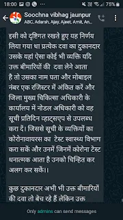 उन्होंने बताया कि इसी को दृष्टिगत रखते हुए यह निर्णय लिया गया था प्रत्येक दवा का दुकानदार उसके यहां ऐसा कोई भी व्यक्ति यदि उक्त बीमारियों की दवा लेने आता है तो उसका नाम पता और मोबाइल नंबर एक रजिस्टर में अंकित करें और जिला मुख्य चिकित्सा अधिकारी के कार्यालय में नोडल अधिकारी को वह सूची प्रतिदिन व्हाट्सएप से उपलब्ध करा दें। जिससे सूची के व्यक्तियों का कोरोनावायरस का टेस्ट स्वास्थ्य विभाग करा सकें और उनमें जिनमें कोरोना टेस्ट धनात्मक आता है उनको चिन्हित कर अलग कर सकें।